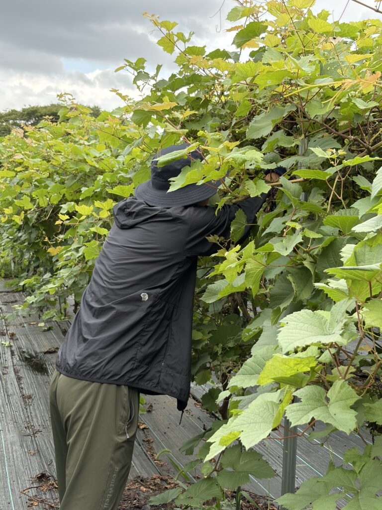 1時間半ほどの収穫作業を通じて、参加者はメイヴの果皮の厚さ、香りの豊かさ、陽に透ける果実の色など、五感を通して“ぶどうそのものの力”を感じ取りました。それぞれの手で収穫した房は、まさに未来の都市ワインの原点ともいえる存在でした。