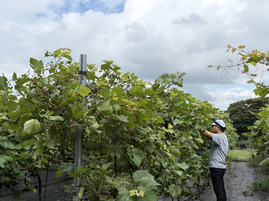 秋の気配を感じ始めた佐倉市のメイヴ畑には、陽光に照らされて輝くブドウの房がずらりと並んでいました。