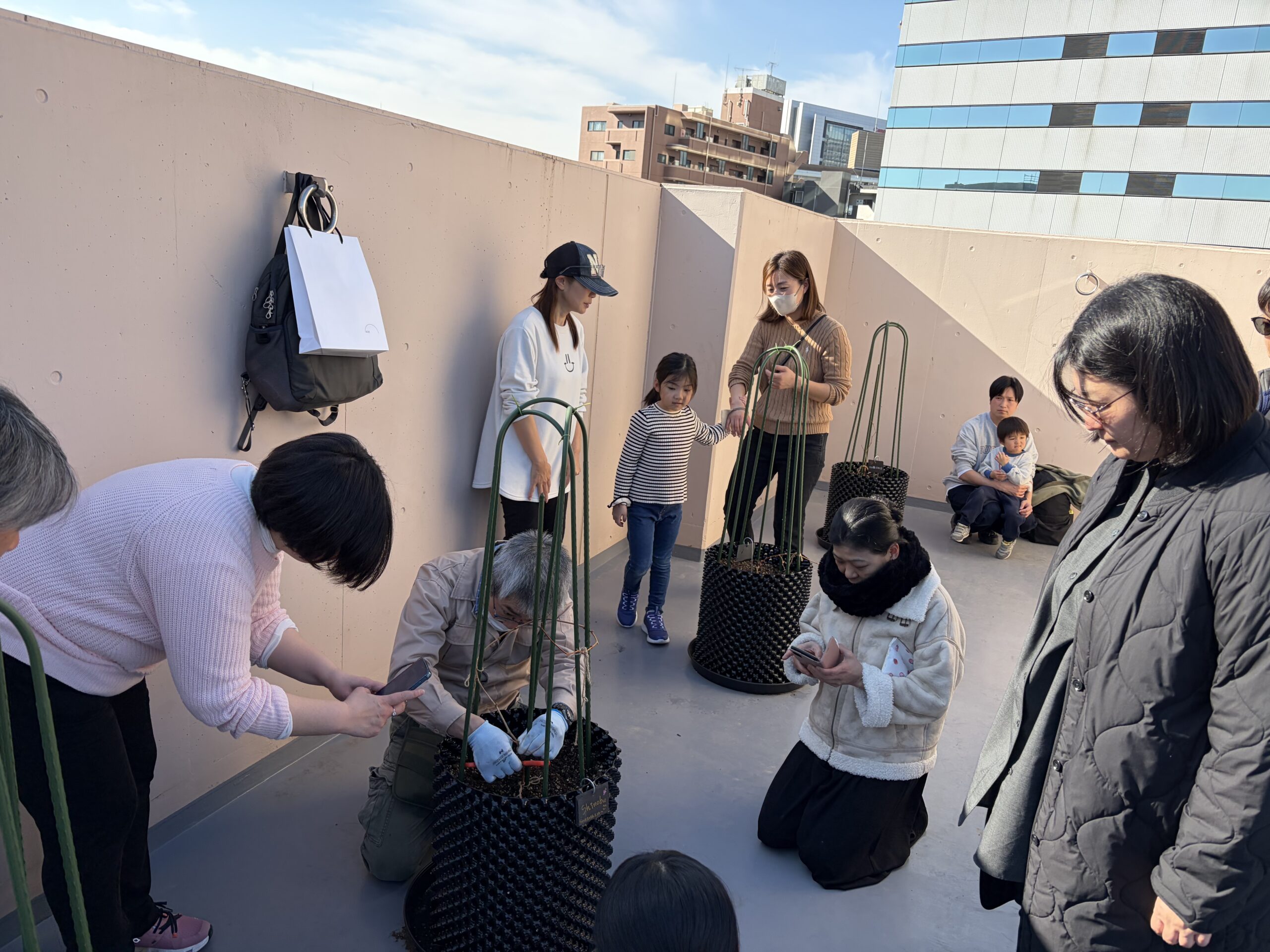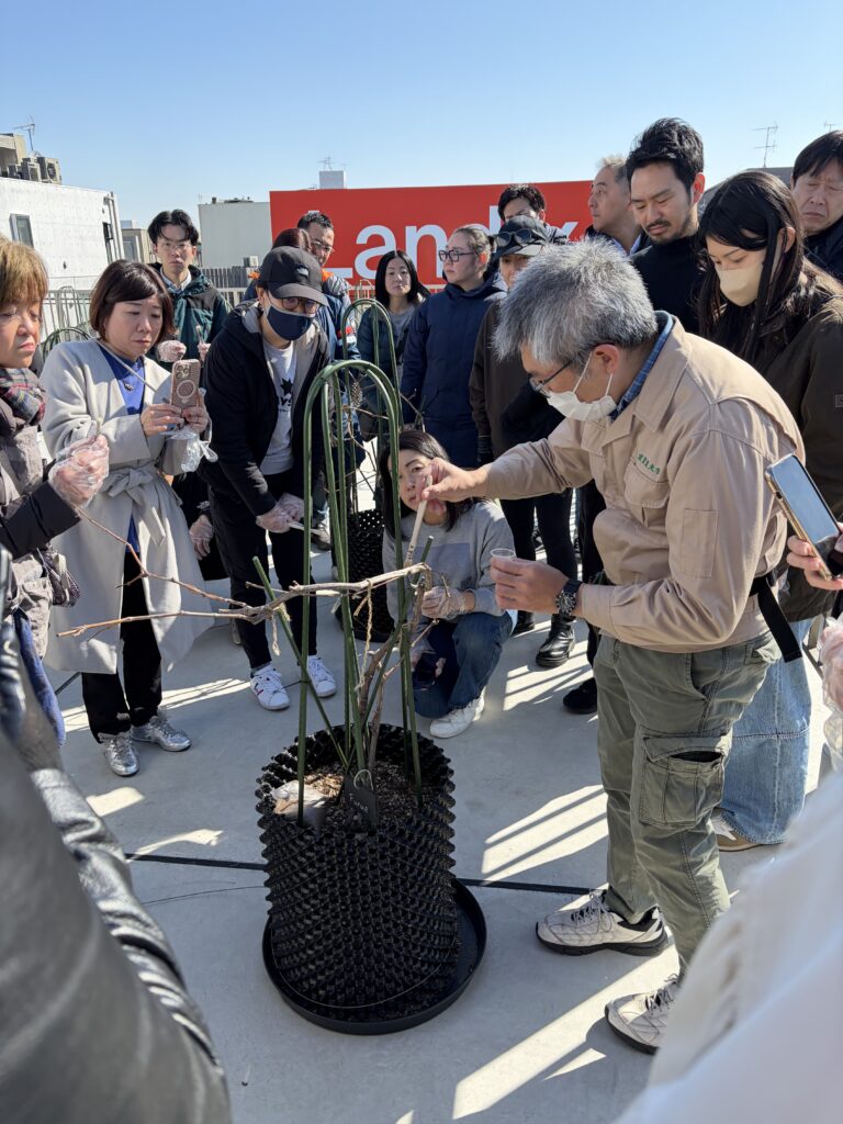 屋上という都市の空の下、専門家のレクチャーを受けながら、自分の苗木に手を入れる。